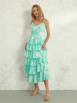 Women Floral Print Long Dress V-Neck Tiered Ruffles Sleeveless Cami Dress Summer Casual Beach Party Dress