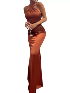 Women Solid Color Long Dress, Cross Halter Backless Ball Gown Cocktail Party Evening Dresses