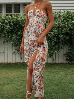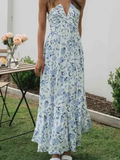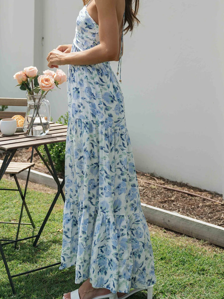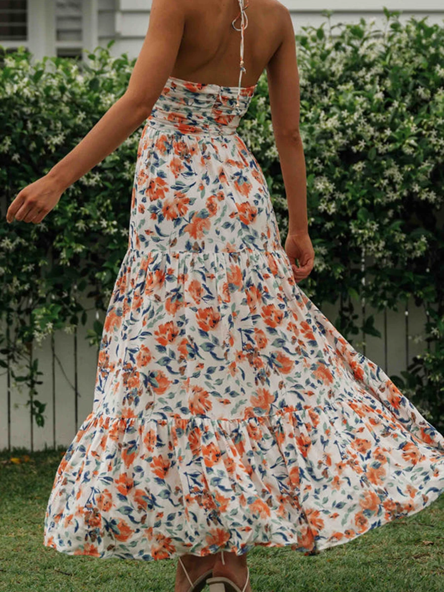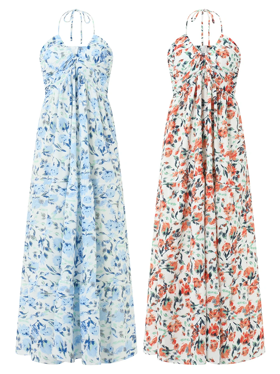 Women Long Dress, Elegant Sleeveless Tie-up Halterneck Floral Dress Summer Swing Dress
