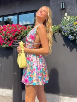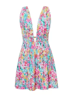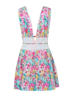 Women Summer Dress Flower Sleeveless Deep V Neck Backless Pleated Dress Bohemian Party Beach Sexy Elegant Dresses Female