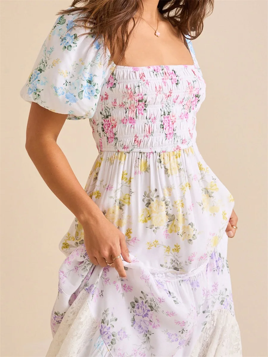 Floral print, square neckline, bubble short sleeves, ruffled hemline, A-line and ankle length design; Casual dress with sleeves; Elegant dress for women, highlighting feminine charm