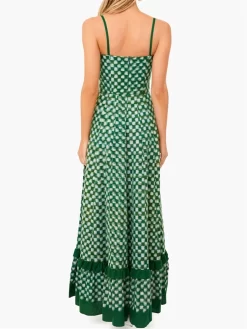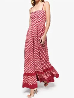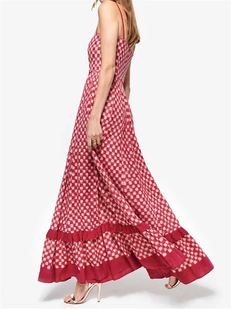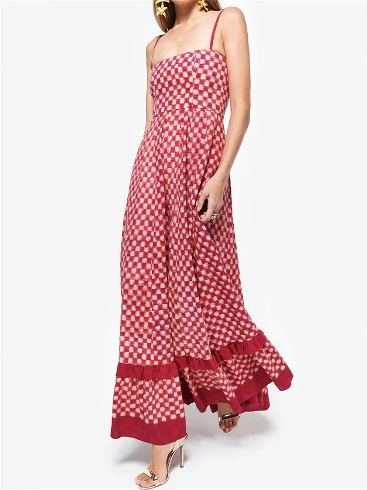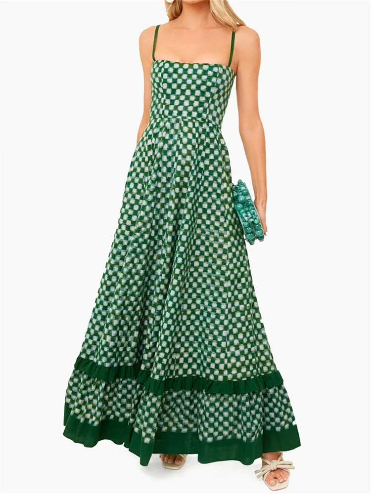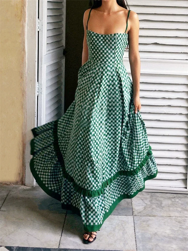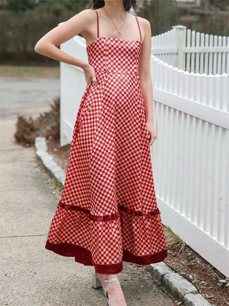 Women’s Long Beach Dress Sleeveless Spaghetti Strap Checkerboard Print Flowy Dress Midi Slip Dress