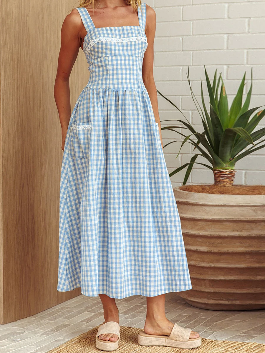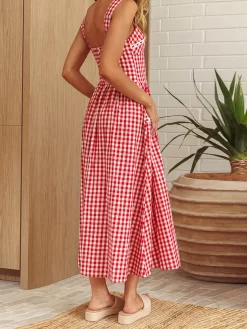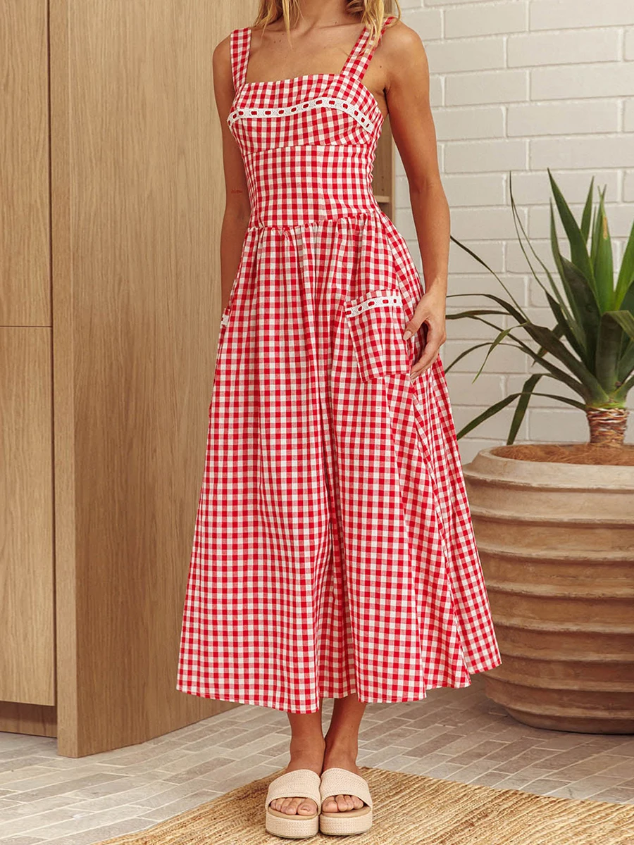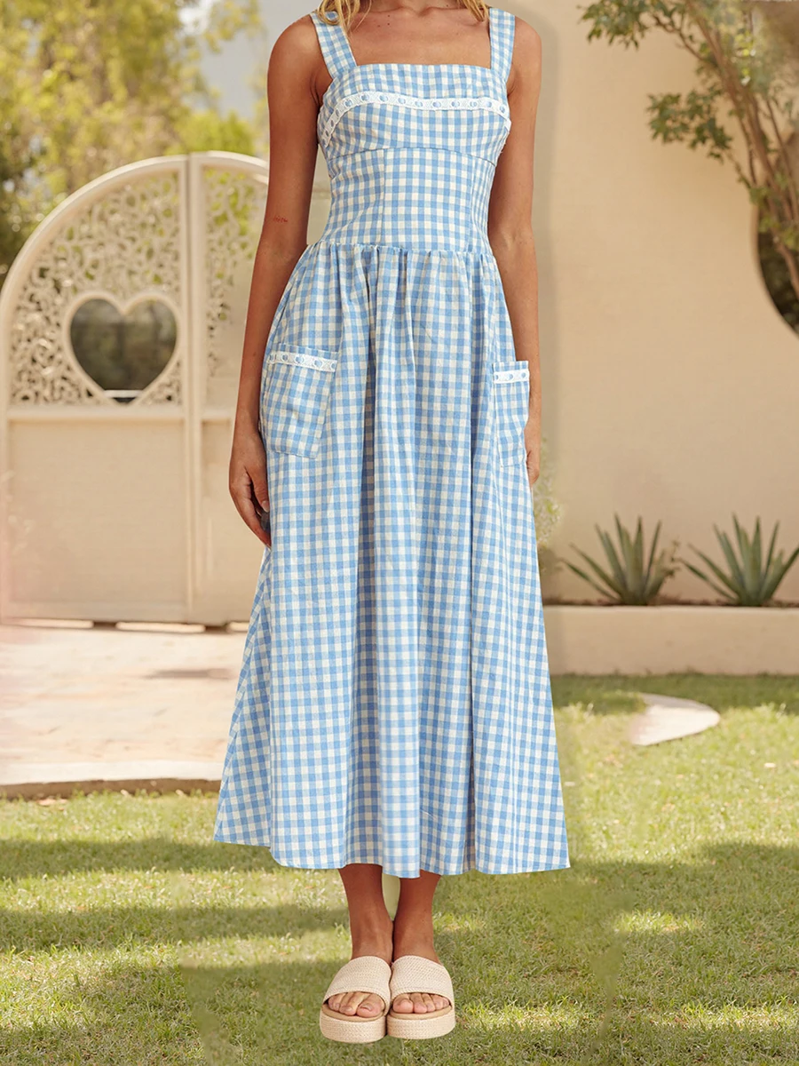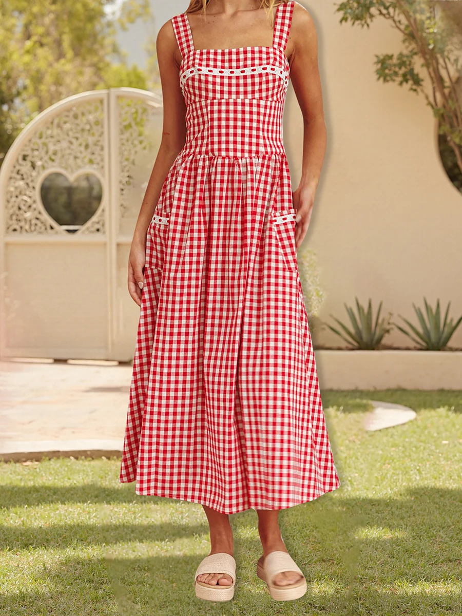 Women’s Summer Long Cami Dress Sleeveless Open Back Plaid Beach Dress with 2 Pockets